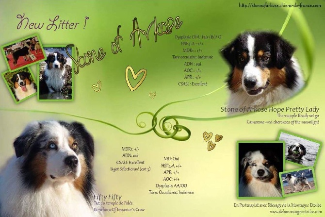 Se mariage est réalisé avec Camille Voisin (elevage de la montagne étoilée) qui est aussi la propriètaire de Fifty le papa des bébés. Bien entendu les 2 parents sont testés pour les dysplasies, tares occulaires et géntiquement (AOC, APR, HSF4 et MDR1)